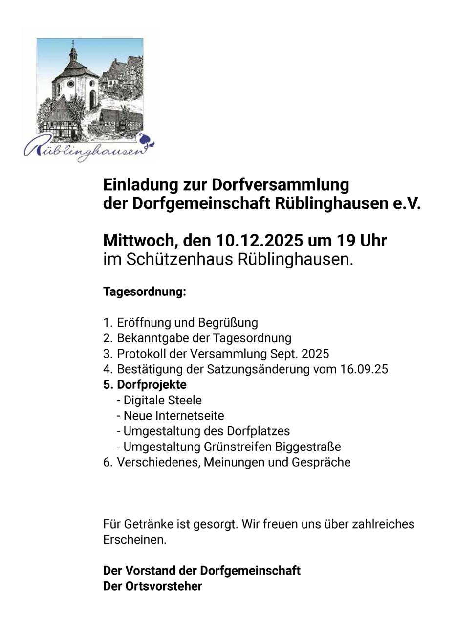 | Mi | 10. Dez | 19:00 | Dorfversammlung - AUSHANG - | Schützenhaus | Rüblinghausen |